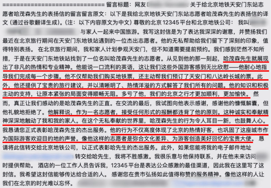 外国游客给平安地铁志愿者哈茂森的表扬信