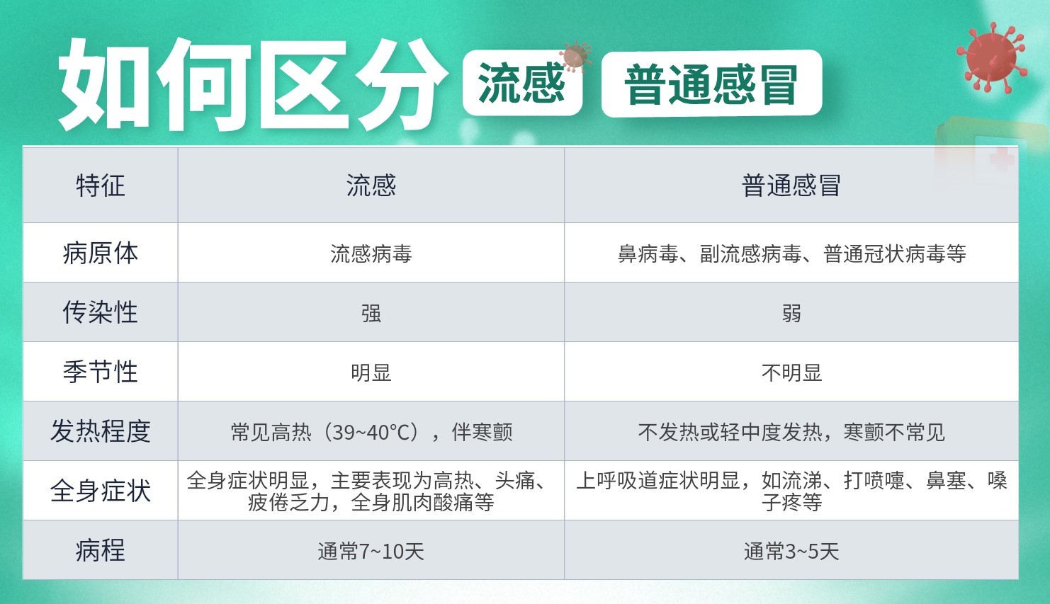 流感和普通感冒虽然都是呼吸道疾病,且轻症流感常与普通感冒表现相似,但两者是完全不同的。普通感冒以打喷嚏、鼻塞、流鼻涕、咳嗽为主,而流感则全身症状较重。流感主要有以下三个明显特征:
